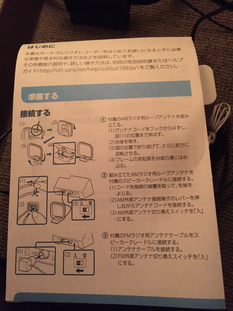 「準備① アンテナを組み立てる」。は?! 充電したらすぐ使えると思ってた…。組み立てる? 「コード先端部の被覆を取り、先端をよじる」理科の実験を思い出します。アナログラジオを舐めてました。写真見て頂くと分かるかと思いますが、ちょっと薄暗いですよね。アロマライトの真横で、跪いて作業してます 笑。大変だよ、想定外だよ。